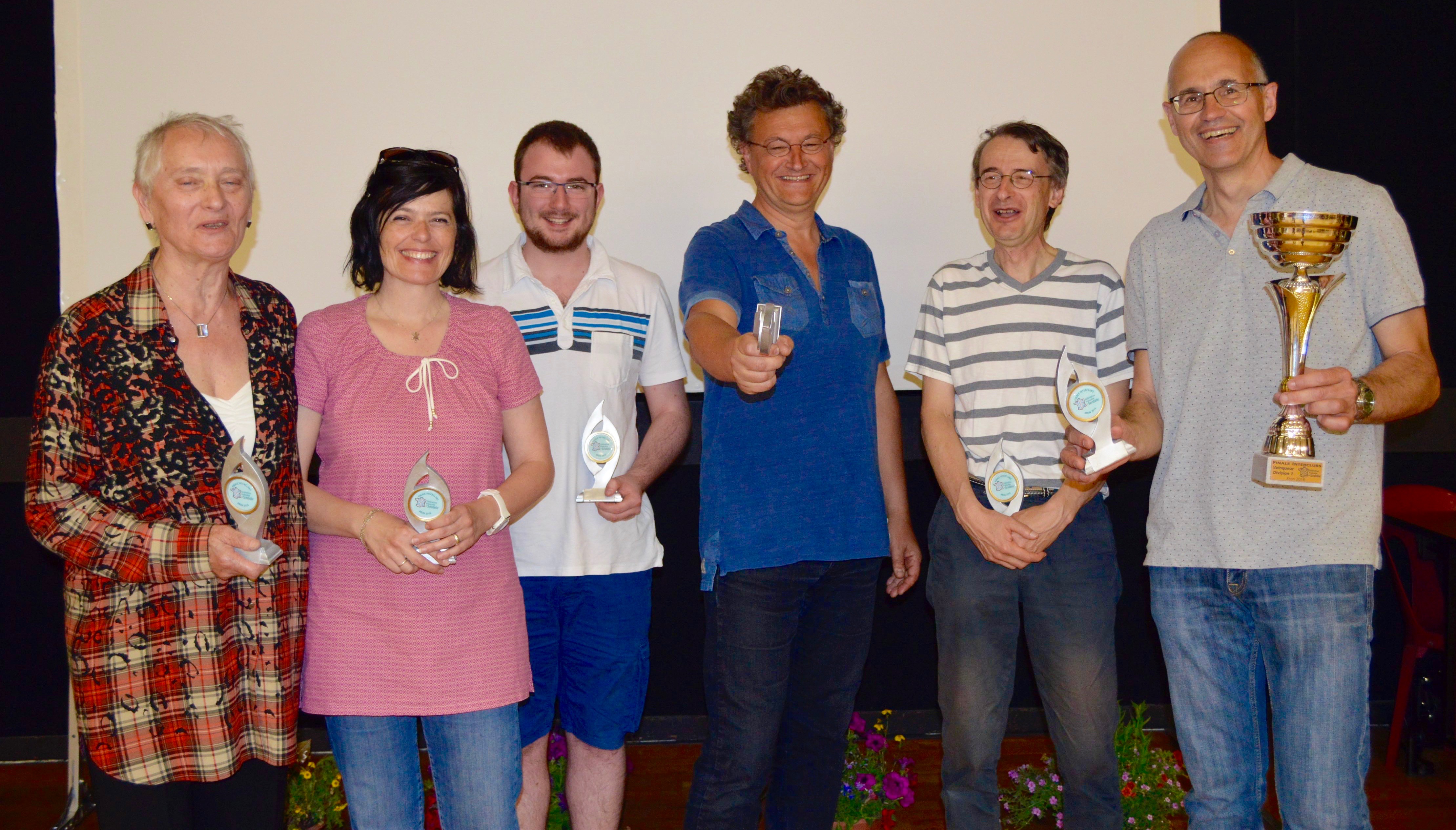 Saluons aussi bien bas la performance de l’équipe JEUNES de PIFO (4 benjamins et 1 poussine, donc 63 ans maximum à eux tous !) : non seulement c’est la première équipe de jeunes à atteindre la phase finale, mais elle a encore poussé la performance jusqu’à gagner le titre en division 6. D’ailleurs, ils ont aussi gagné à l’applaudimètre lors du palmarès.