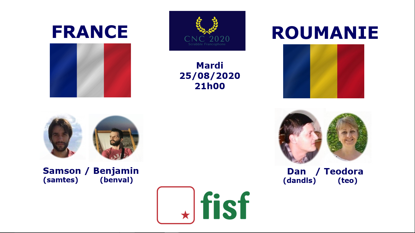 FRANCE-ROUMANIE ce soir à 21h La France joue sa qualification pour les quarts de finale de cette toute nouvelle compétition internationale qui se déroule en cinq parties, sur le modèle de la Coupe Davis. Benjamin VALOUR et Samson TESSIER représentent la FFSc dans la Coupe des Nations. Suivez en direct le match, commenté, de ce soir sur https://www.youtube.com/c/Scrabblophile/live et retrouvez toutes les parties, les classements et les participants sur le site de la FISF (Fédération Internationale de Scrabble Francophone).