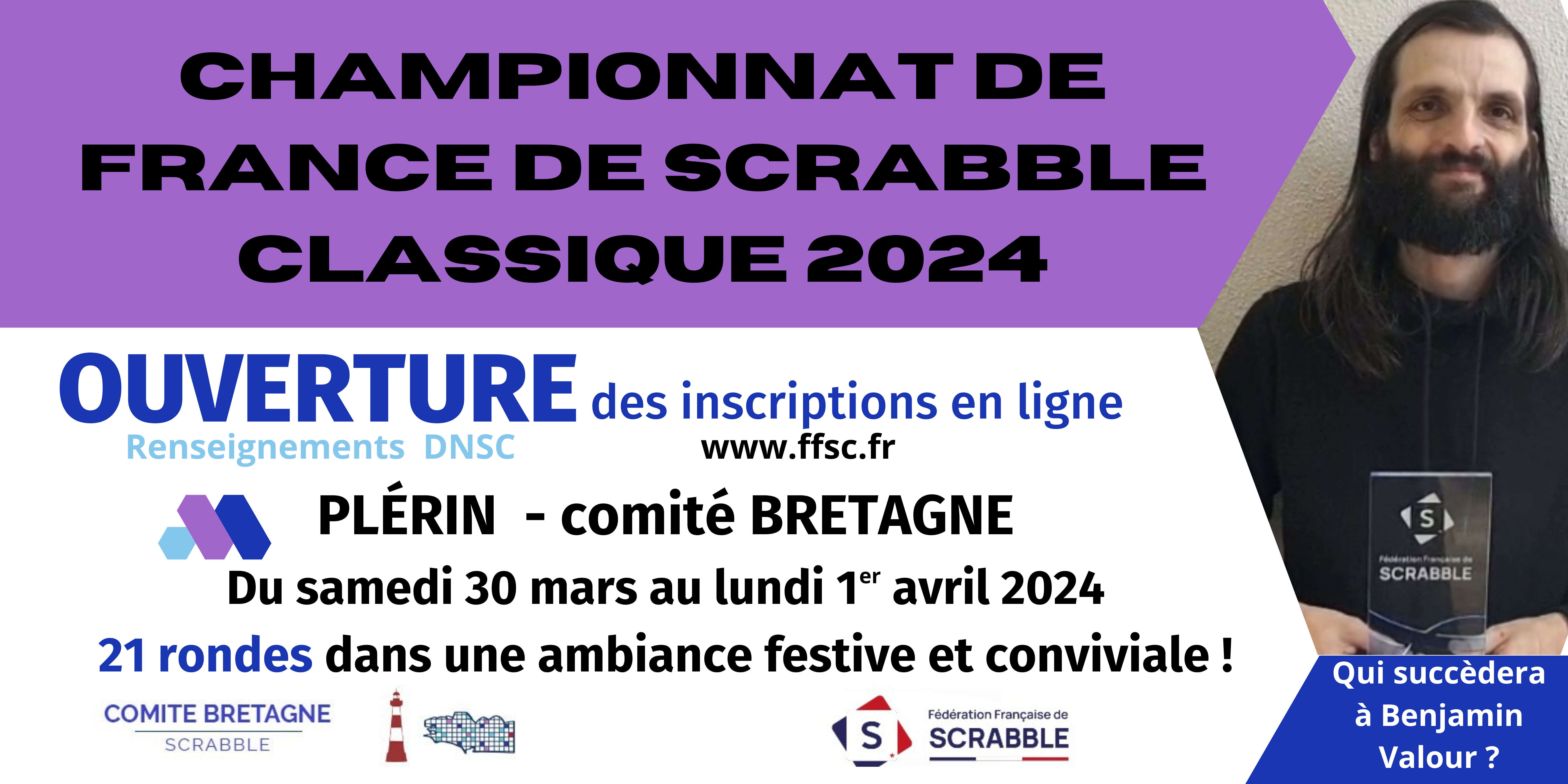 Qui sera présent le 30 mars à l’appel des joueurs (à 14h15 pour une première ronde programmée à 14h30) pour succéder à Benjamin Valour (Comité Flandres) au palmarès du Championnat de France de Scrabble Classique 2023 lors de la précédente édition organisée à Golbey ?