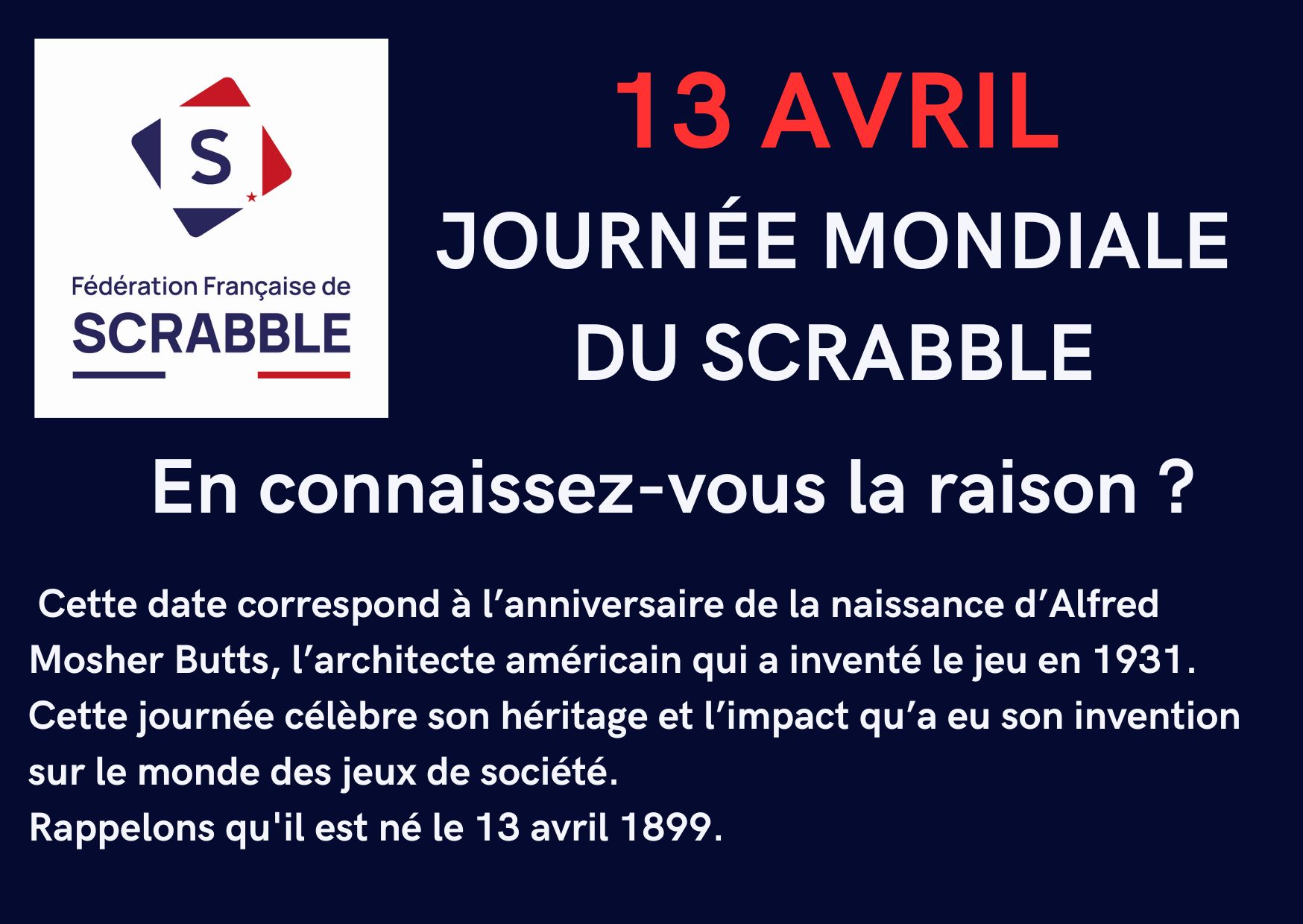 Comme il en existe pour bien d’autres choses et différentes causes, la journée mondiale du Scrabble est organisée le 13 avril. Cette date correspond à l’anniversaire de la naissance d’Alfred Mosher Butts, l’architecte américain qui a inventé le jeu en 1931. Cette journée célèbre son héritage et l’impact qu’a eu son invention sur le monde des jeux de société. Rappelons qu'il est né le 13 avril 1899.