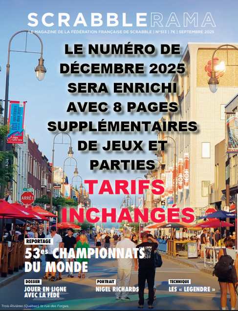 Scrabblerama : c'est Noël avant l'heure ! Le numéro de décembre sera enrichi de 8 pages supplémentaires avec jeux et parties inspirées de vos suggestions recueillies lors de la dernière enquête !