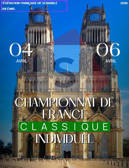 La Fédération Française de Scrabble a le plaisir d’annoncer la tenue de la 44e édition du Championnat de France de Scrabble Classique , qui se déroulera du 4 au 6 avril 2026.