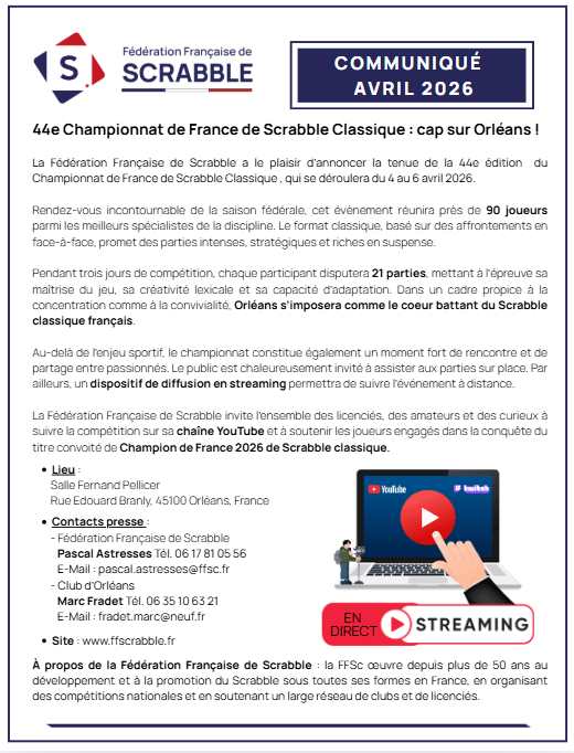 La Fédération Française de Scrabble invite l’ensemble des licenciés, des amateurs et des curieux à suivre la compétition sur sa chaîne YouTube et à soutenir les joueurs engagés dans la conquête du titre convoité de Champion de France 2026 de Scrabble classique.