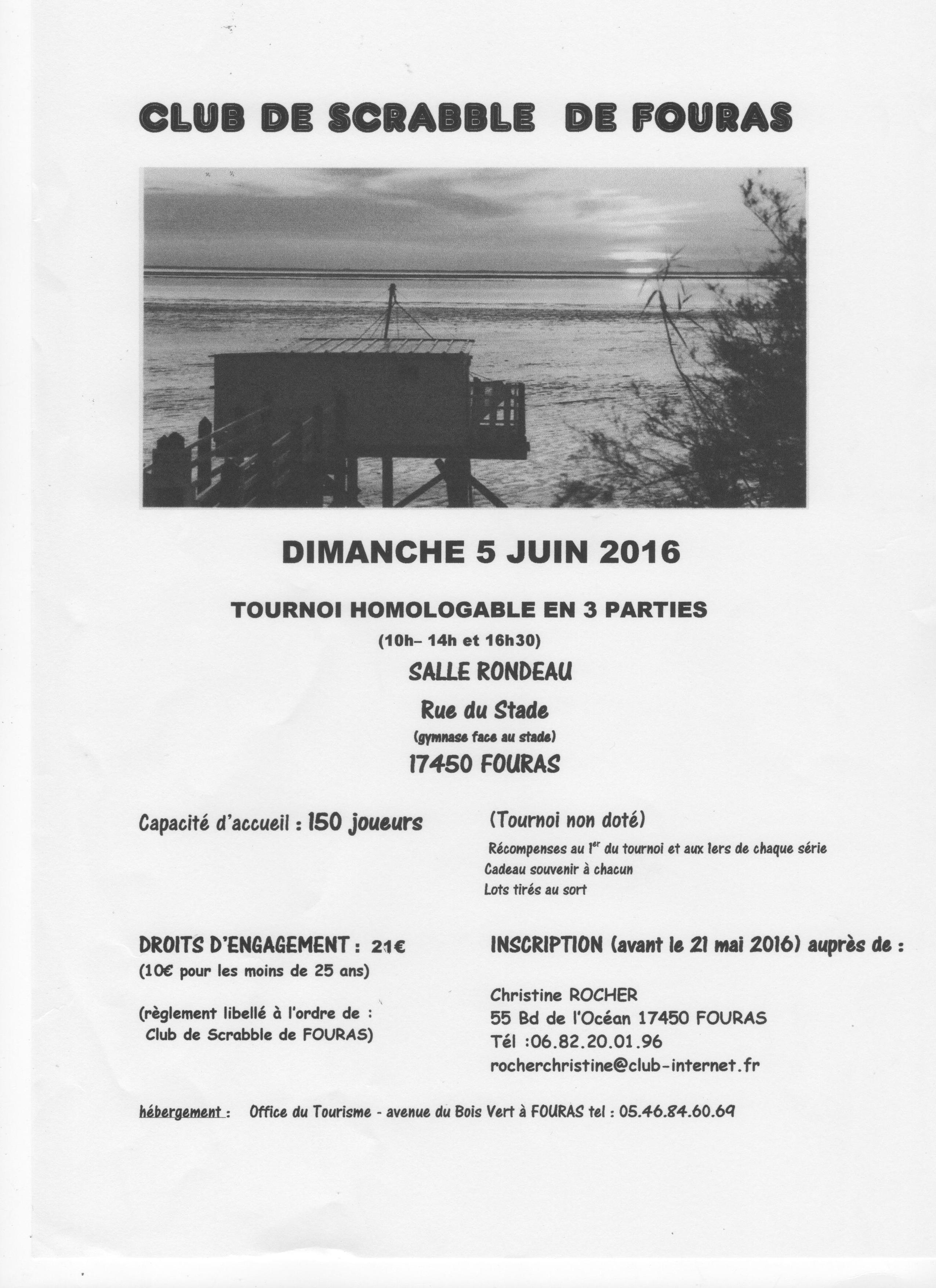 Règlement à l'ordre du Scrabble Club de Fouras avant le 21 mai 2016 Inscriptions auprès de : Mme Christine ROCHER 55, Boulevard de l'Océan 17450 FOURAS Tél. : 06 82 20 01 96 E-mail : rocherchristine@club-internet.fr | Non renseigné |