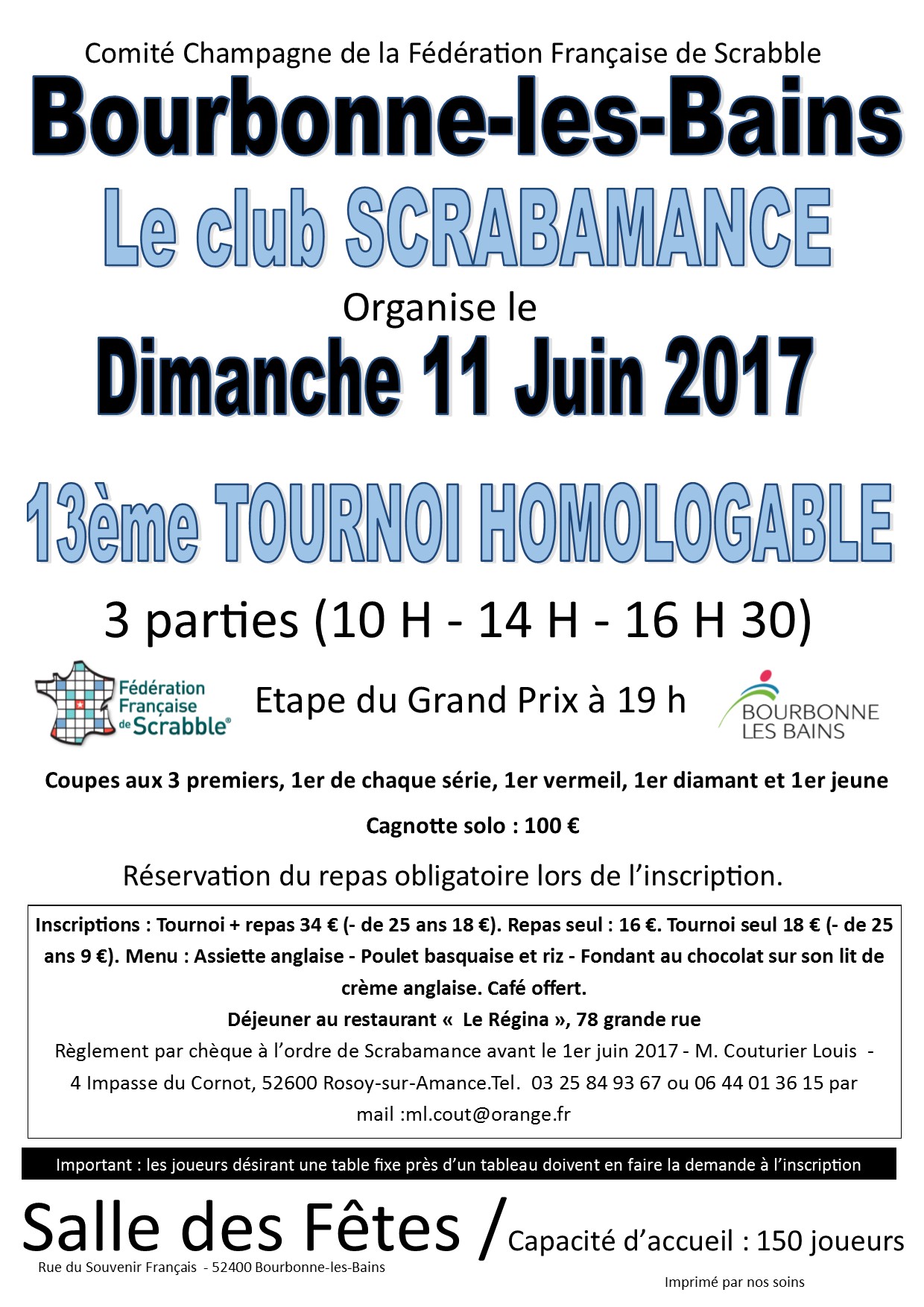 Règlement par chèque à l'ordre de "Scrabamance" à envoyer avant le 1er juin 2017 Inscriptions auprès de : M. Louis COUTURIER 4, Impasse du Cornot 52600 ROSOY-SUR-AMANCE Tél. : 03 25 84 93 67 E-mail : ml.cout@orange.fr |