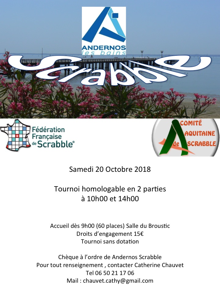 Chèque à l'ordre "d'Andernos Scrabble" Inscriptions auprès de : Mme Catherine CHAUVET 20, avenue des Chênes 33510 ANDERNOS Tél. : 06 72 32 53 68 E-mail : chauvet.cathy@gmail.com |